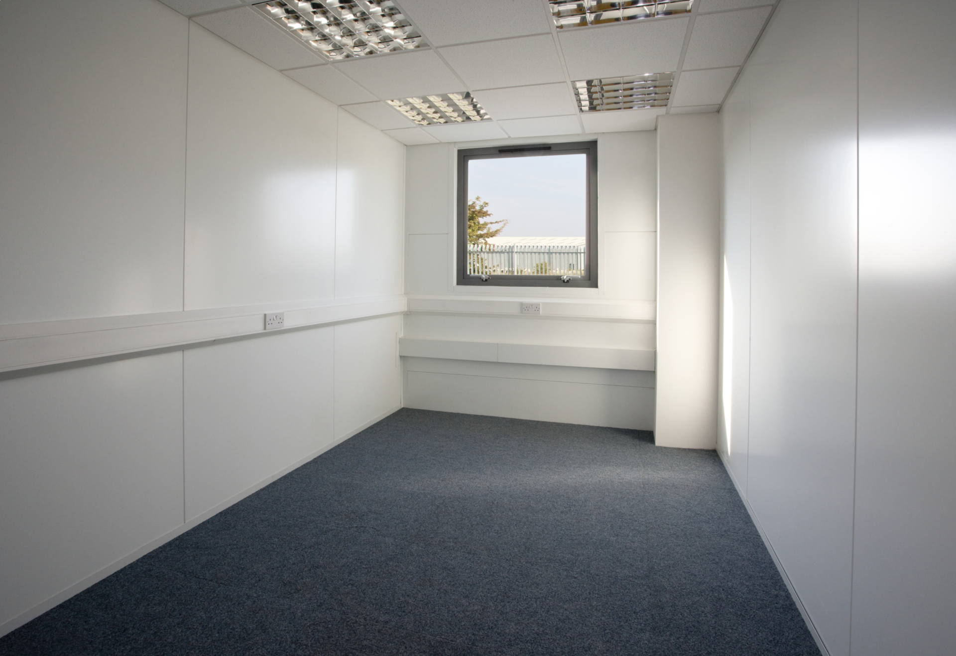Carpet-tile flooring and hygienic vinyl in welfare areas for durability and ease of maintenance.