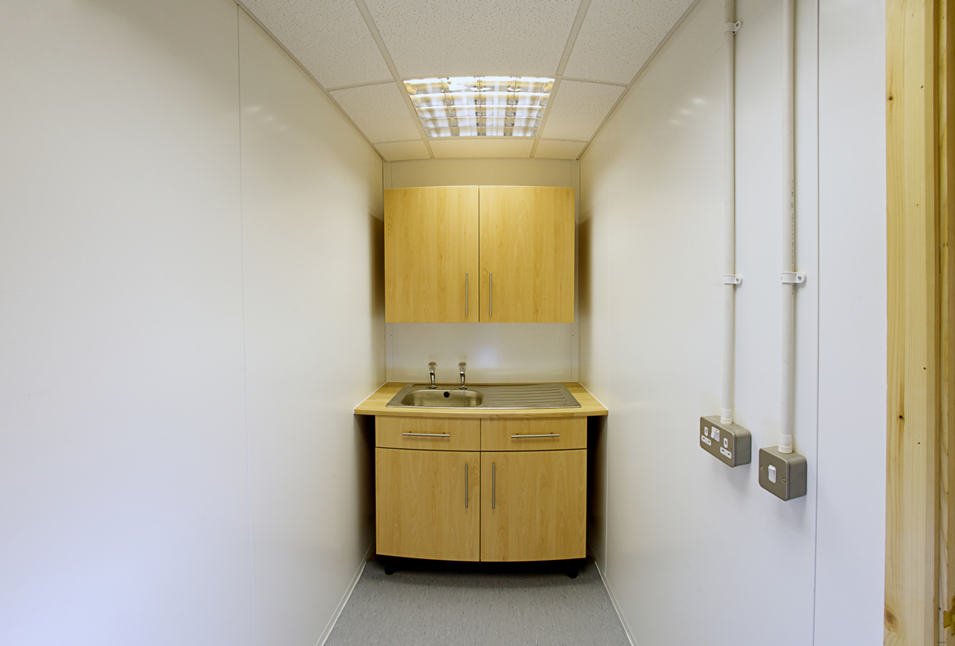 Kitchenettes fitted with sinks, water heaters, and base/wall units to suit staff use.External Works & Parking